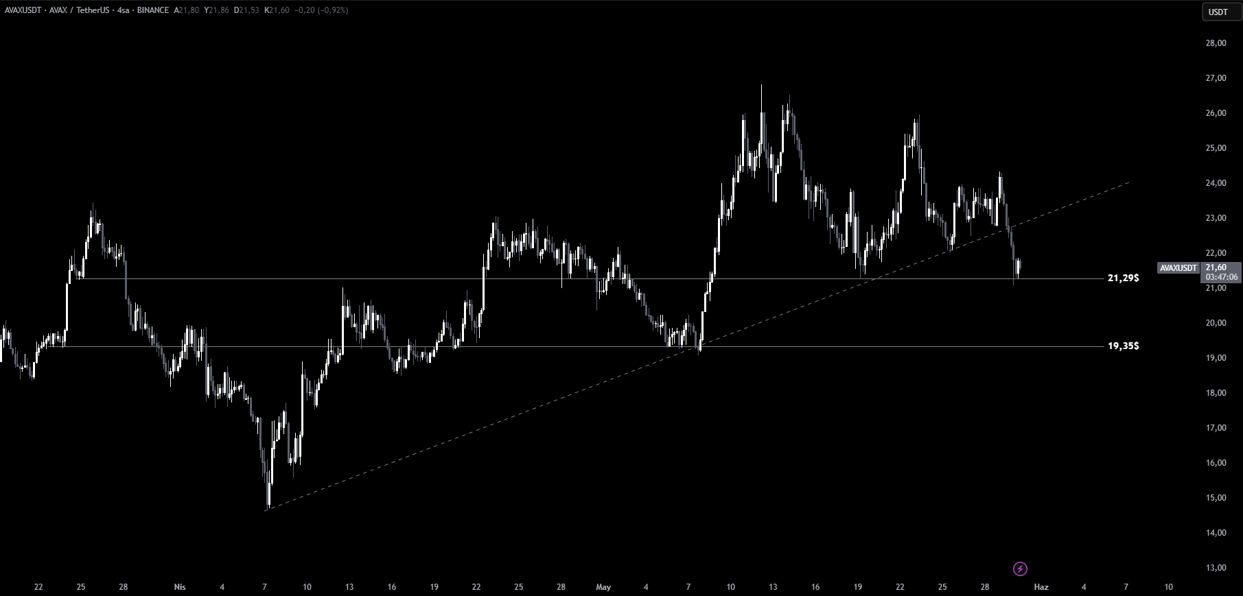 4 saatlik grafikteki yükselen kanalın alt bandını aşağı yönlü kıran AVAX, bu hareketle birlikte 21,29$ seviyesine kadar geriledi. Bu destek bölgesi, kısa vadede tepki alımıyla karşılaşsa da fiyat henüz kaybedilen trend yapısına geri dönmüş değil.