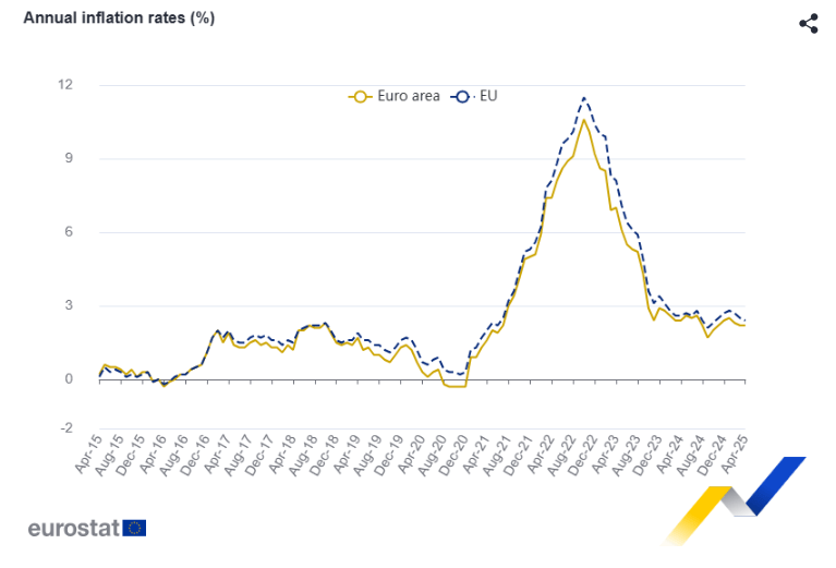 Eurostat tarafından yayımlanan son verilere göre, Avrupa Bölgesi yıllık enflasyon oranı Nisan 2025’te %2,2 seviyesinde sabit kaldı. Bu oran, Mart 2025’le aynı seviyede olup, bir yıl önceki %2,4’lük orana kıyasla hafif bir düşüşe işaret ediyor.