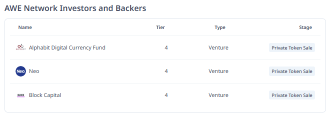 AWE Network, Alphabit Digital Currency Fund, Neo, Block Capital, NGC Ventures ve Zonff Partners gibi önde gelen yatırım firmalarından destek almıştır. Yaklaşık 7 milyon USD’lik başlangıç yatırımı, projenin merkeziyetsiz ve yenilikçi vizyonunu destekleyen güçlü bir finansal temel sağlar.