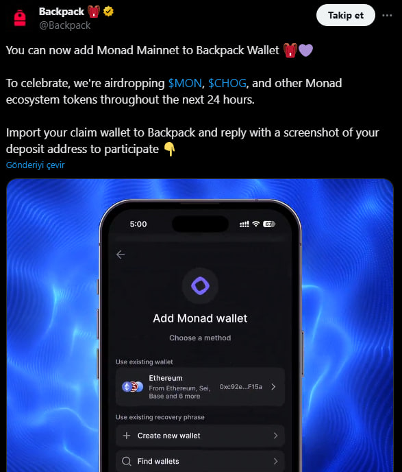 Mainnet entegrasyonunu kutlamak amacıyla Backpack, MON, CHOG ve ekosistemdeki diğer Monad token’larını içeren özel bir airdrop kampanyası başlattı. Kampanya yalnızca 24 saat sürecek ve katılım şartları oldukça basit tutuldu.