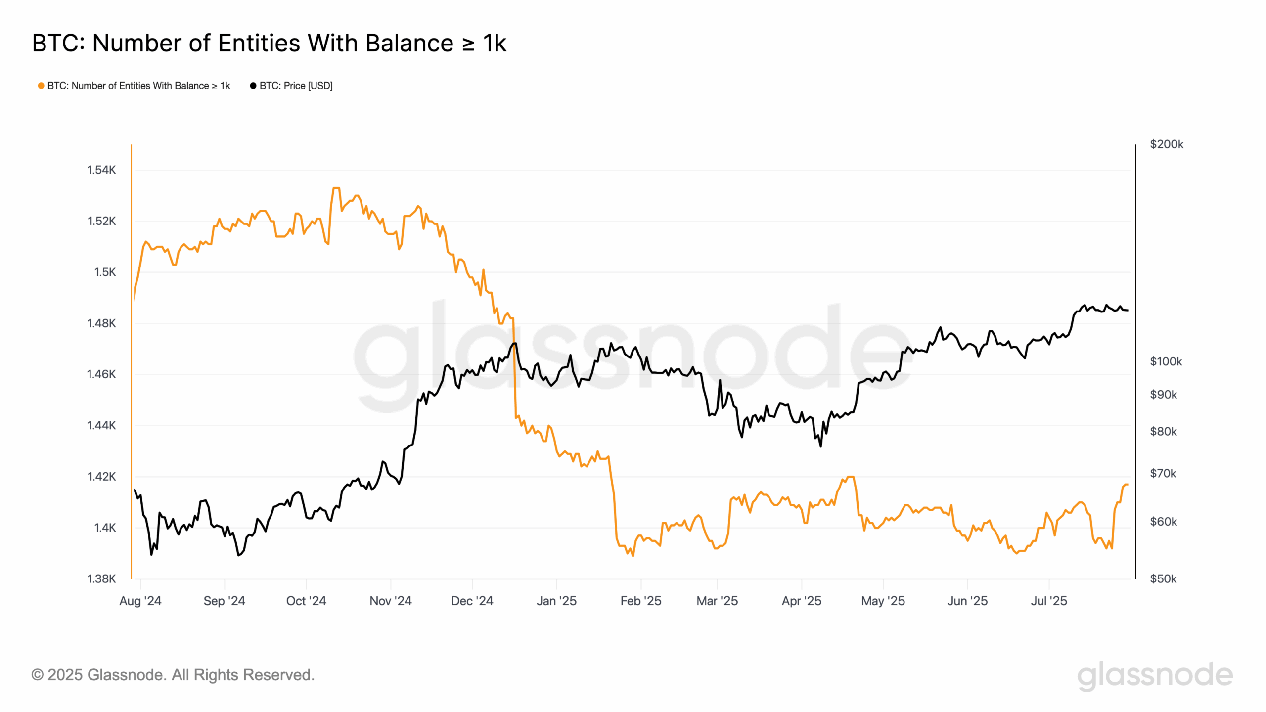 Glassnode verilerine göre, en az 1.000 BTC tutan benzersiz balina varlıklarının sayısı son bir hafta içinde 1.392’den 1.417’ye yükseldi. Bu artış, 2025 yılı içindeki en yüksek balina sayılarından biri olarak kayda geçti ve kurumsal ya da büyük çaplı yatırımcıların güveninin yeniden tesis edildiğine işaret ediyor.