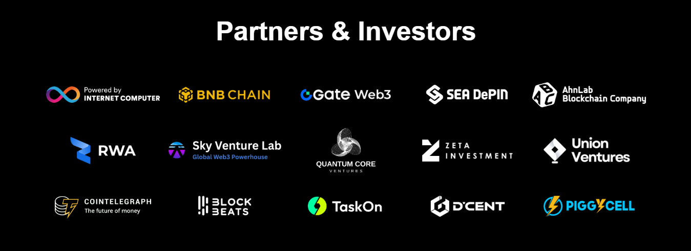 Projenin arkasında, blockchain ve Web3 ekosisteminin farklı alanlarında faaliyet gösteren güçlü iş ortakları ve yatırımcılar yer almaktadır. Partnerler arasında Internet Computer, BNB Chain, Gate Web3, SEA DePIN, AhnLab Blockchain Company, RWA, Sky Venture Lab, Quantum Core Ventures, Zeta Investment, Union Ventures, Cointelegraph, Block Beats, TaskOn, D’Cent, PiggyCell ve BeatSwap bulunuyor. Bu geniş iş birliği ağı, projenin küresel ölçekte benimsenmesini ve teknik altyapısının güçlenmesini destekliyor.