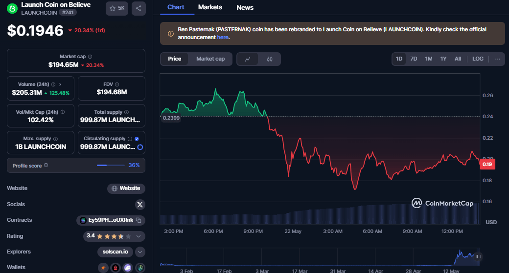 LAUNCHCOIN, Believe platformunun resmi token’ı olmasa da, platformun kurucusu Ben Pasternak’ın PASTERNAK token’ının yeniden markalaşmış hali. Mayıs 2025’te LAUNCHCOIN, 10 milyon dolardan 240 milyon doların üzerine çıkarak büyük bir sıçrama yaptı. Bu başarı, Believe’in potansiyelini ve topluluğun platforma olan ilgisini gösteriyor.