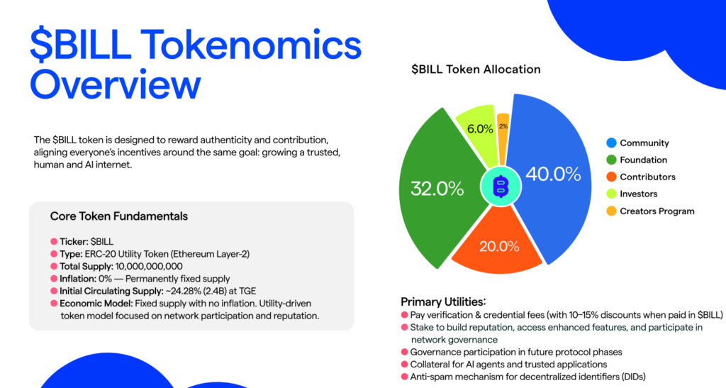 $BILL, 10 milyar adet sabit arzlı ve enflasyonu olmayan bir hizmet tokenıdır. TGE (Listelenme) anında arzın yaklaşık %24,28’i dolaşıma girerken, dağılım şu şekilde planlanmıştır: