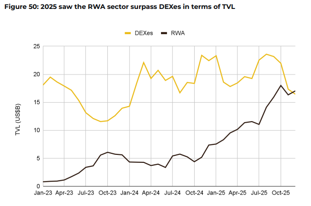Merkeziyetsiz finans, 2025’te daha kurumsal bir yapıya evrildi. Toplam kilitli değer 124 milyar dolar civarında dengelenirken, sermaye kompozisyonu stablecoin’ler ve getiri üreten varlıklara kaydı. En dikkat çekici gelişmelerden biri, gerçek dünya varlıklarının (RWA) DeFi içinde merkeziyetsiz borsaları geride bırakması oldu.