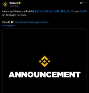 Kripto para piyasasının en büyük borsalarından biri olan Binance, spot piyasalarda önemli bir delist kararı aldığını duyurdu. Binance tarafından yapılan resmi açıklamaya göre, ACA, CHESS, DATA, DF, GHST ve NKN token’ları için tüm spot işlem çiftleri 13 Şubat 2026 saat 06:00 (TSI) itibarıyla işlemden kaldırılacak. Bu karar, Binance’in düzenli olarak gerçekleştirdiği listeleme inceleme süreci kapsamında alındı ve ilgili token’larda işlem yapan yatırımcılar için kritik bir gelişme olarak öne çıkıyor.