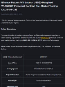 Binance Futures, 23 Ağustos 2025 tarihinde saat 11:30 (TSİ ) USDⓈ-Marjinli WLFIUSDT Sürekli Sözleşmesini piyasaya süreceğini duyurdu.