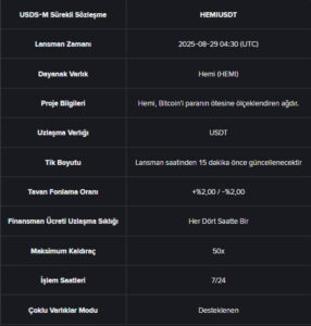 Buna ek olarak, Binance Futures platformunda HEMIUSDT Sürekli Sözleşmesi 50x’e kadar kaldıraçla 2025-08-29 07:30 (TSI) tarihinde aktif olacak. Bu yeni vadeli işlem ürünü, kullanıcıların HEMI tokeninde kaldıraçlı işlem stratejileri geliştirmesine imkân tanıyacak.