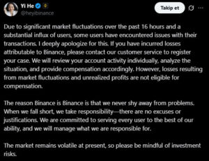 “Yoğun piyasa dalgalanmaları sırasında kullanıcılarımızın bazı işlem hatalarıyla karşılaştığını biliyoruz. Bu süreçte şeffaf olacağız. Kayıp yaşayan tüm kullanıcıların, Binance müşteri hizmetleri aracılığıyla talep oluşturmasını istiyoruz. Ekiplerimiz her bir vakayı ayrı ayrı inceleyecek.”
