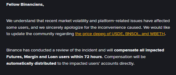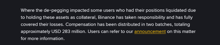 “Değer kaybı, bu varlıkları teminat olarak tutan bazı kullanıcıların pozisyonlarının tasfiye edilmesine neden olduğunda, Binance sorumluluğu üstlenmiş ve kayıplarını tamamen karşılamıştır. Kullanıcılarımızın güvenliği ve memnuniyeti her zaman önceliğimizdir.”