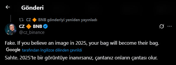 “Sahte. 2025 yılında bir ekran görüntüsünün gerçek olduğuna inanıyorsanız yakında varlıklarınız başkalarının varlıkları haline gelecek.”