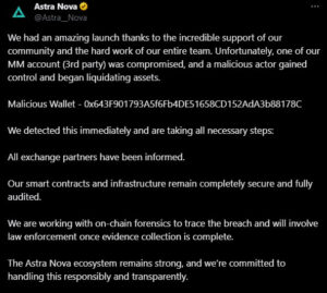 Astra Nova ekibi, saldırının fark edilmesiyle birlikte hızlı bir şekilde harekete geçtiğini açıkladı. Şirket, hem borsalarla hem de blok zinciri güvenlik uzmanlarıyla iş birliği yaparak fonların izini sürmeye başladığını ve kanıtlar toplandıkça kolluk kuvvetleriyle iletişime geçileceğini bildirdi.