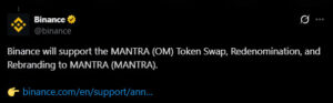 OM token’ın delist edilmesinin ardından Binance, yeni marka adıyla MANTRA’yı listeleyecek: