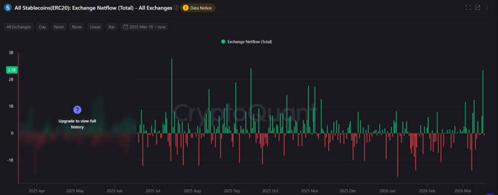 Kripto veri platformu CryptoQuant verilerine göre aynı gün borsalara toplam stablecoin net akışı 2,3 milyar doların üzerine çıktı. Böyle bir büyüklük en son 2025’in dördüncü çeyreğinde görülmüştü.