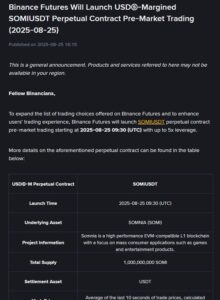 Kripto para piyasasının önde gelen platformu Binance Futures, yeni bir hamleyle $SOMI tokeni vadeli işlemlerine ekliyor. SOMIUSDT sürekli sözleşmesi, 25 Ağustos 2025 tarihinde piyasa öncesi işlemlere açılacak.