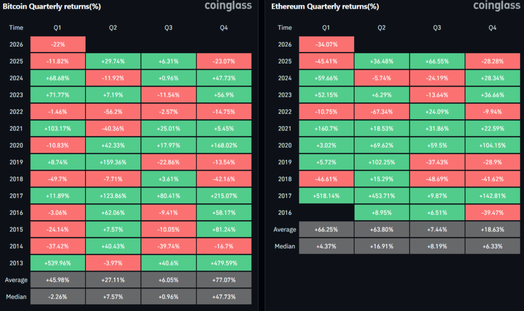 Verilere göre Bitcoin, bugüne kadar 13 farklı ilk çeyreğin yedisini kırmızı kapattı. En sert darbe 2018’de geldi (%49,7). Daha yakın örneklerde ise 2020’de %10,8, 2025’te %11,8’lik kayıplar görüldü — bu rakamlar CoinGlass kayıtlarında net şekilde yer alıyor.