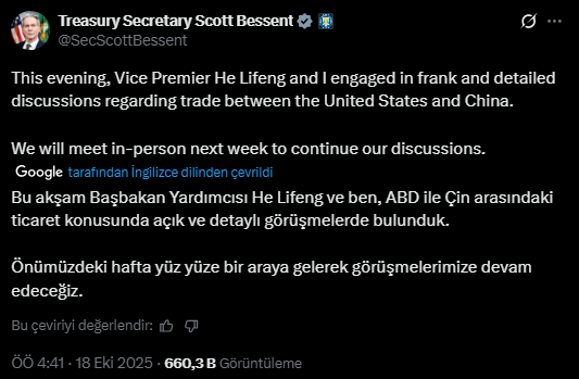 Bununla birlikte, piyasanın toparlanmasında ABD ve Çin arasındaki diplomatik gelişmeler de etkili oldu. Piyasalar, ABD Başkanı Donald Trump ile Çin Devlet Başkanı Xi Jinping’in bu ay içinde Güney Kore’de düzenlenecek Asya-Pasifik Ekonomik İşbirliği (APEC) zirvesinde bir araya gelmesini bekliyor.