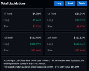 Fiyatlardaki ani düşüş, kaldıraçlı işlemlerde büyük tasfiyeleri de beraberinde getirdi. Coinglass verilerine göre, son 24 saatlik toplam likidasyon miktarı 467 milyon doların üzerine çıktı. Bu rakamlar, piyasadaki kaldıraç yoğunluğunun ne kadar yüksek olduğunu bir kez daha ortaya koydu. Tasfiyelerin büyük bölümünün long pozisyonlardan oluşması, yatırımcıların yükseliş beklentisiyle açtığı işlemlerin sert düşüş karşısında hızla kapandığını gösterdi. Son verilere göre 137 binden fazla yatırımcı likide olurken, en büyük tekil likidasyon HTX borsasında BTC/USDT işlem çiftinde gerçekleşti. Yaşanan bu büyük tasfiye dalgası, kripto piyasasının kısa vadede ne kadar kırılgan olduğunu ve ani fiyat hareketlerinin zincirleme satışlara yol açabildiğini bir kez daha gözler önüne serdi.