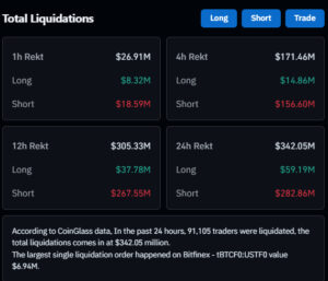 Son yükselişle birlikte kripto türev piyasasında önemli tasfiyeler de yaşandı. Son 24 saat içinde toplam 340,98 milyon dolar değerinde pozisyon likide edildi.