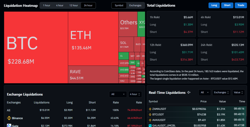 CoinGlass verilerine göre son 24 saatte 177 binden fazla yatırımcı likide oldu. Toplam tasfiye hacmi 530 milyon dolara ulaştı. Bunun 425 milyon dolarlık kısmını ise Bitcoin ve Ethereum üzerindeki short işlemler oluşturdu. Tasfiyelerin büyük bölümü son 12 saat içinde gerçekleşti.