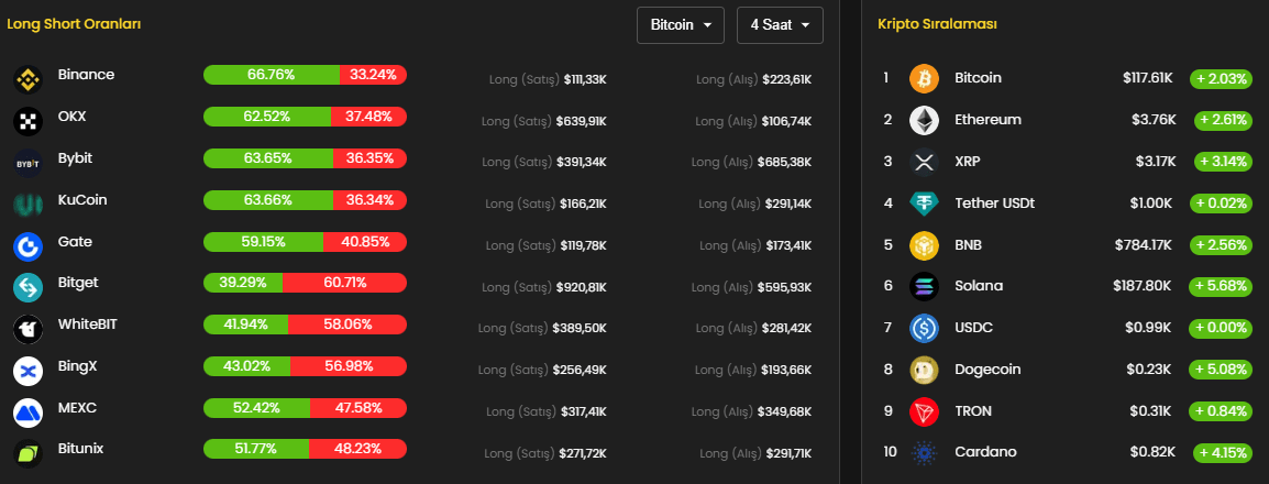 Önde gelen borsalardaki long/short oranlarına bakıldığında, long pozisyonların ağırlıkta olduğu dikkat çekiyor. Bu durum, yatırımcıların kısa vadeli yükseliş beklentisini yansıtıyor. Ancak her zamanki gibi yüksek kaldıraçlı işlemlere karşı dikkatli olunması gerektiği unutulmamalı.