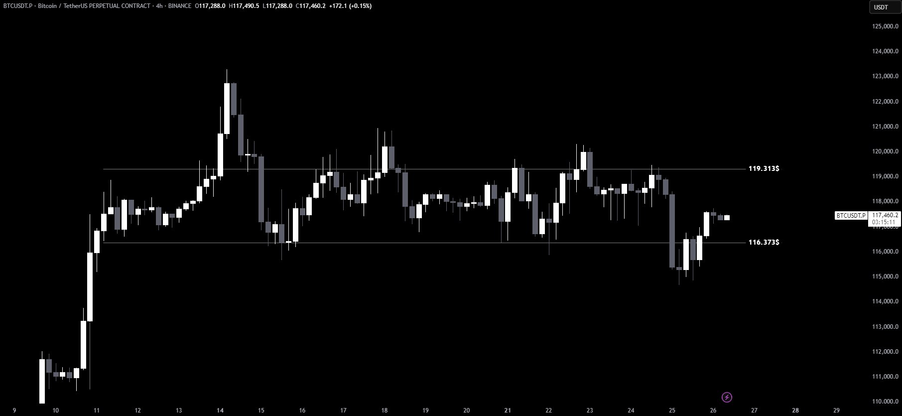 Kripto para piyasaları haftanın sonuna doğru hareketli bir sürece girdi. Bitcoin, dün gece yaşanan fiyat hareketiyle birlikte 116.373 dolar desteğinin altına sarkmasına rağmen hızlı bir şekilde toparlanarak yeniden konsolidasyon bölgesine döndü. Bu düşüş hareketinin büyük ölçüde manipülatif bir hamle olduğu görüşü ağır basarken, fiyatın yeniden belirlenen aralığa dönmesi yatırımcılar için umut verici oldu.
