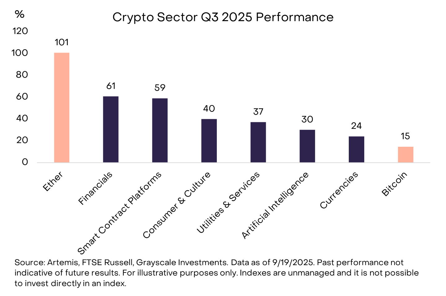 Grayscale’in yayımladığı son rapora göre, üçüncü çeyrekte kripto piyasalarında genel olarak pozitif getiriler kaydedildi. Bitcoin, Ether, yapay zekâ odaklı projeler ve akıllı kontrat ekosistemi artış yaşarken, performans açısından Bitcoin diğerlerine göre zayıf kaldı.