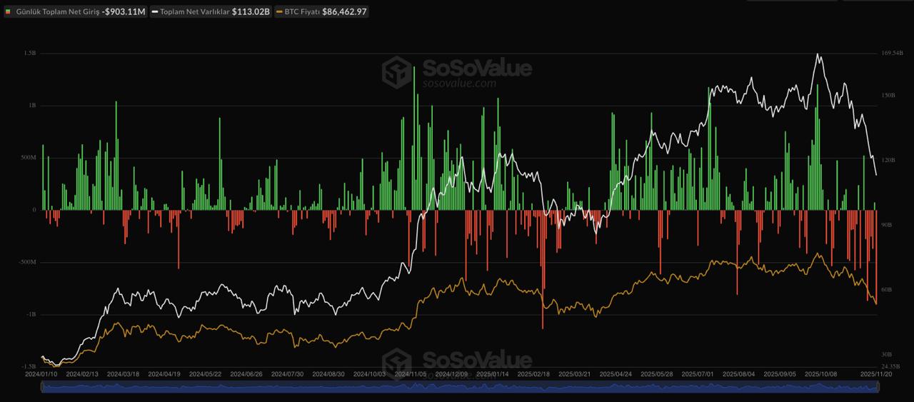 20 Kasım 2025’te ETF piyasası, satış baskısını en sert şekilde hissetti. Bitcoin ETF’lerinde 903 milyon dolar, Ethereum ETF’lerinde ise 261 milyon dolar net çıkış yaşandı. Bu rakamlar, özellikle Bitcoin ETF’leri için tarihin en yüksek çıkışlarından biri olarak değerlendiriliyor.