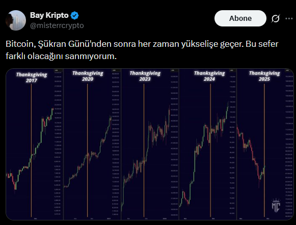 Haftalık grafikte RSI göstergesinin 30 seviyesine yaklaşması da analistin görüşünü destekliyor. Daha önceki döngülerde bu bölgeye yapılan temaslar, fiyatın dip oluşturduğu dönemlerle oldukça yakından ilişkilendirilmiş durumda. Analist, bunun yeni bir boğa trendinin başlangıcı olduğunun garantisini vermese de, kısa vadeli bir dönüş için güçlü bir sinyal oluşturduğunu ifade ediyor.