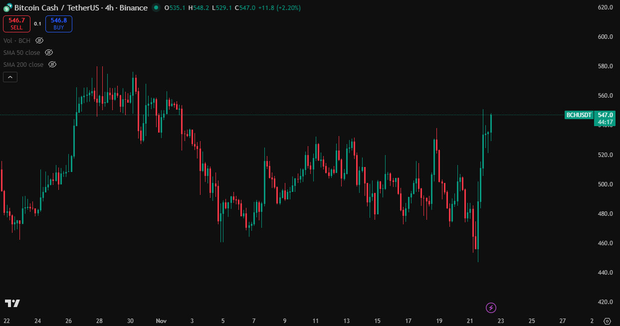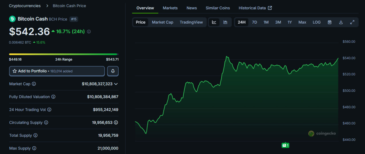 Bitcoin Cash (BCH) piyasası bugün yeniden canlanmış durumda. BCH fiyatı, son 24 saatte %13’ü aşan güçlü bir yükselişle 542 dolar civarında işlem görüyor. Ani yükseliş sırasında fiyat 475 dolardan 542,91 dolara kadar çıktı ve günlük işlem hacmi 900 milyon doları geçerek piyasadaki ilginin yeniden arttığını ortaya koydu.