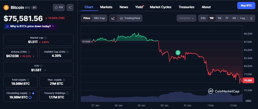 Bitcoin, haberin yazıldığı saat itibarıyla 78.690 dolar civarında işlem görüyor. Mevcut fiyat, 5 Ekim’de görülen 126.100 dolarlık tüm zamanların en yüksek seviyesine kıyasla yaklaşık %38 aşağıda bulunuyor.