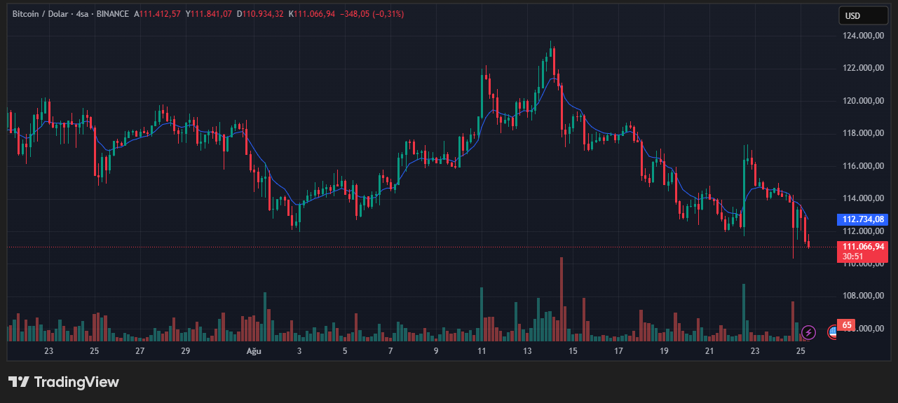 Geçtiğimiz Cuma günü Fed Başkanı Jerome Powell’ın faiz indirimi sinyali veren konuşması sonrası BTC’de kısa süreli bir yükseliş görülmüştü. Ancak büyük bir yatırımcının bu yükselişte satış yapmasıyla fiyat yeniden aşağıya döndü. Böylece, 14 Ağustos’ta görülen $124,500’luk tüm zamanların en yüksek seviyesinden %11’lik bir geri çekilme yaşandı.