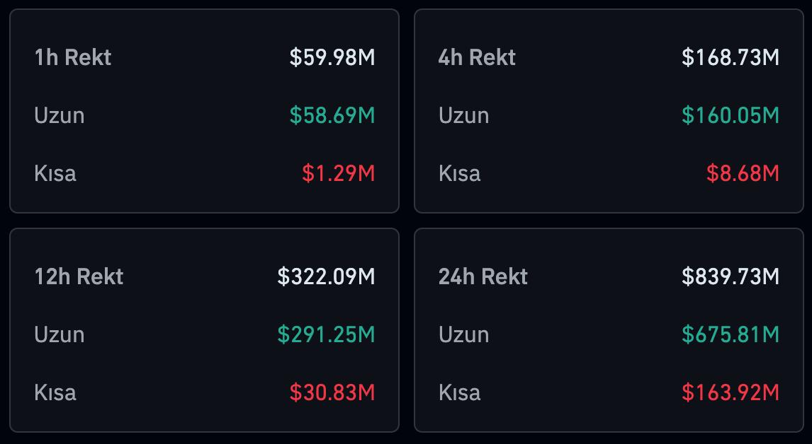 Verilere göre, son 24 saatte toplam 840 milyon dolar değerinde pozisyon tasfiye edildi. Bunun 675,81 milyon doları long, 263,92 milyon doları short pozisyonlardan oluştu.