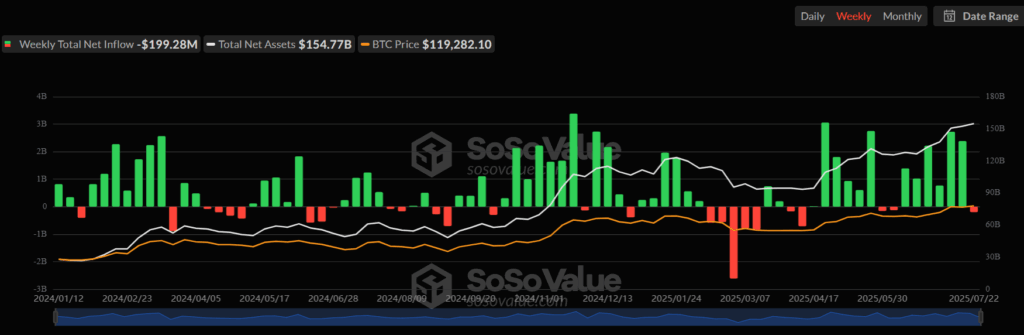 Bitcoin, 14 Temmuz’da ulaştığı rekor seviye olan 122.054 dolar sonrası geri çekilme yaşadı. Kurumsal yatırımcılar, US listeli spot Bitcoin ETF’lerinden bu hafta toplamda 199 milyon dolar çıkış gerçekleştirdi. Altı hafta boyunca süren net girişler yerini çıkışlara bıraktı.