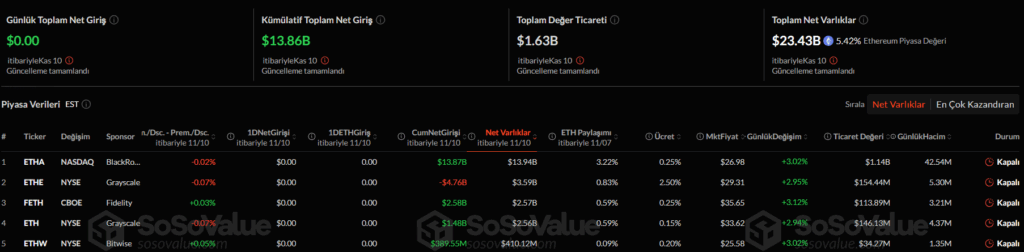 Ethereum ETF piyasası 10 Kasım’da herhangi bir net giriş kaydetmedi. BlackRock’un ETHA fonu 13,94 milyar dolarlık varlığıyla önde giderken, Grayscale’in ETHE fonu -4,76 milyar dolar kümülatif çıkışla dikkat çekti. Bitwise ETHW fonu ise 410 milyon dolar seviyesinde sınırlı bir büyüme kaydetti.