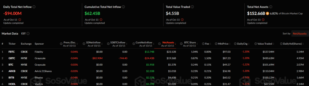 15 Ekim verilerine göre Bitcoin (BTC) spot ETF’leri 94 milyon dolarlık günlük net çıkış kaydederken, Ethereum (ETH) ETF’leri 5.32 milyon dolarlık girişle günü pozitif tamamladı.