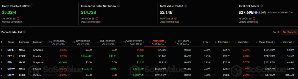 Ethereum ETF’leri tarafında tablo daha dengeliydi. Günlük toplam net giriş 5.32 milyon dolar olurken, toplam kümülatif net giriş 14.72 milyar dolar seviyesine ulaştı.