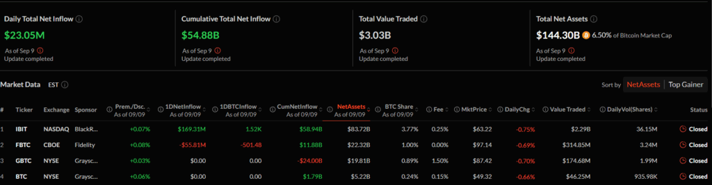 9 Eylül itibarıyla Bitcoin ETF piyasasında 23,05 milyon dolarlık günlük net giriş kaydedildi ve kümülatif toplam net giriş 54,88 milyar dolar seviyesine ulaştı. Toplam işlem hacmi 3,03 milyar dolar, toplam net varlıklar ise 144,30 milyar dolar olarak belirlendi; bu, Bitcoin piyasa değerinin %6,50’sine denk geliyor.