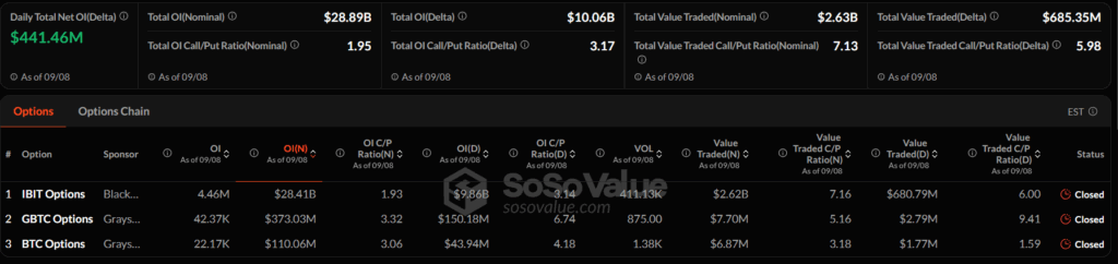 Toplam Bitcoin Opsiyon Hacmi: Bitcoin opsiyonlarındaki günlük net OI (Delta) 441,46 milyon dolar, toplam OI (Nominal) ise 28,39 milyar dolar olarak kaydedildi. Buna ek olarak, toplam işlem gören değer (nominal) 2,63 milyar dolar, Delta bazlı değer ise 685,35 milyon dolar seviyesinde.
