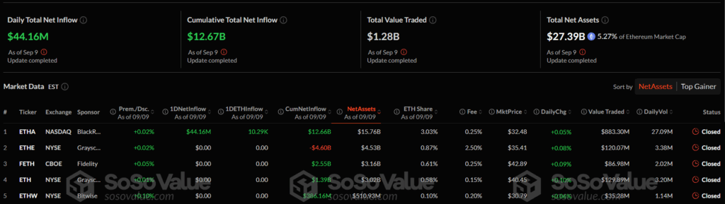 Günlük Net Giriş: Ethereum ETF’lerine 9 Eylül’de 44,16 milyon dolarlık net giriş gerçekleşti. Buna ek olarak, toplam kümülatif net giriş 12,67 milyar dolara ulaştı.