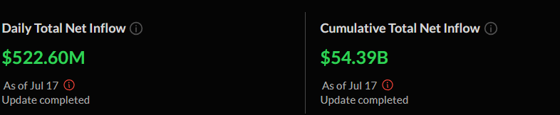 Spot Bitcoin ETF’lerine 17 Temmuz’da toplam 523 milyon dolar net yatırım girişi oldu. BlackRock’ın IBIT fonu 497.3 milyon dolar ile ilk sırada. Öte yandan Fidelity’nin FBTC fonu ise 7.83 milyon dolar ile ikinci. Bu güçlü girişler, Bitcoin’in fiyatını 123.000 dolar seviyesinin üzerine taşıdı. Ve yeni bir zirveye ulaşılmasını sağladı.