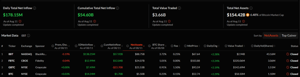 Spot Bitcoin ETF’lerine toplamda 178.15 milyon dolar net giriş sağlandı. BlackRock’ın IBIT adlı fonu bu girişlerin en büyük bölümünü tek başına karşıladı. IBIT, günlük 138.25 milyon dolarlık bir net akış yaşadı. Fidelity’nin FBTC fonu da 12.99 milyon dolar net giriş çekti. Bu veriler, Bitcoin’in piyasa üzerindeki baskın rolünü pekiştiriyor. Ayrıca Grayscale’in GBTC fonu da 7.49 milyon dolar girişle listeye dahil oldu. Grayscale’in BTC fonu 14.24 milyon dolar net giriş aldı.