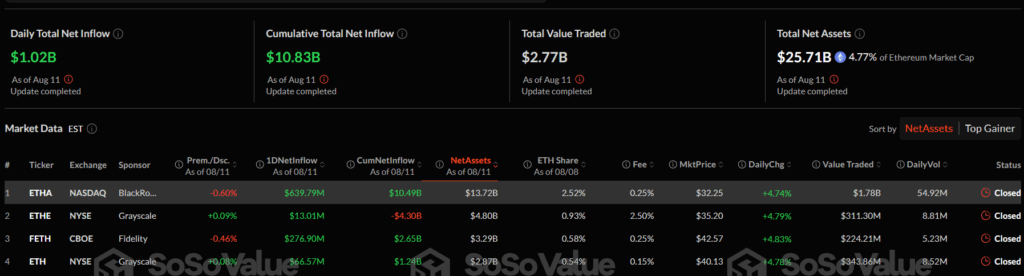 Bitcoin ETF’leri, 11 Ağustos itibarıyla toplamda 54.60 milyar dolarlık birikimli net giriş elde etti. BlackRock’ın IBIT fonu, bu birikimli net girişin 57.92 milyar dolarlık kısmını oluşturuyor. IBIT, piyasa değeri açısından da liderliğini koruyor. Toplam net varlıkları 88.75 milyar dolara ulaştı. Grayscale’in GBTC fonu, 23.70 milyar dolarlık birikimli net çıkışa sahip. Buna rağmen, net varlıkları 21.53 milyar dolar seviyesinde bulunuyor. Öte yandan Ethereum ETF’leri ise daha büyük bir ilgi gördü. 11 Ağustos’ta Ethereum ETF’lerine 1.02 milyar dolar net giriş gerçekleşti. BlackRock’ın ETHA fonu tek başına 639.79 milyon dolar çekerek dikkatleri üzerine topladı. Fidelity’nin FETH fonu da 276.90 milyon dolar net giriş sağladı. Grayscale’in ETHE fonu ise 13.01 milyon dolar net girişle listeye girdi.