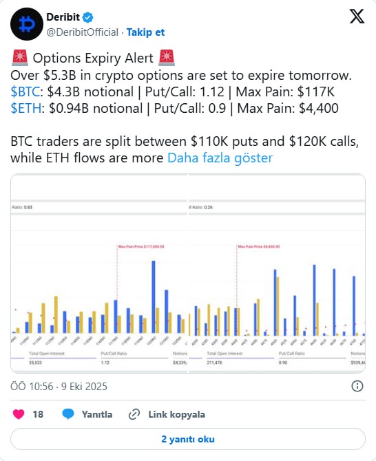 Ayrıca Deribit’in X hesabından yapılan açıklamada, Bitcoin yatırımcılarının 110.000 dolar put ve 120.000 dolar call seviyelerinde yoğunlaştığı, bu aralığın fiyat hareketlerinde kilit rol oynayabileceği belirtildi.