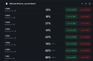 Tahmin piyasası platformu Polymarket verilerine göre yatırımcılar petrol fiyatlarının yükselmeye devam edebileceğini düşünüyor. Piyasada Mart ayı sonuna kadar petrolün 100 dolar seviyesinde kalma olasılığı %82, 110 doların üzerine çıkma ihtimali ise %60’ın üzerinde fiyatlanıyor. Bu beklentiler, enerji piyasasında yukarı yönlü risklerin sürdüğüne işaret ediyor.