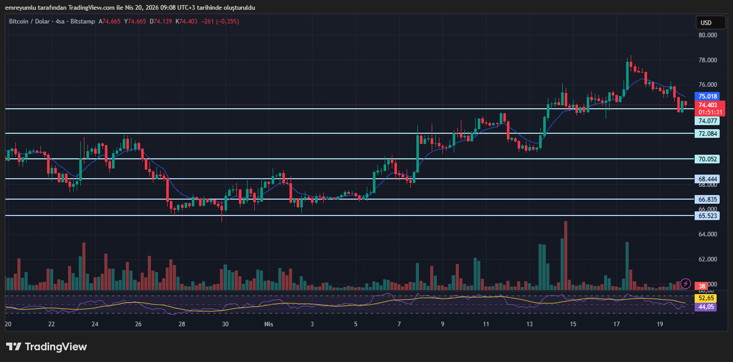 Bitcoin, hafta sonuna güçlü bir yükselişle girse de jeopolitik gelişmelerin etkisiyle bu kazançlarını hızla geri verdi. ABD ile İran arasında sağlanan ateşkesin kırılgan hale gelmesi, piyasalarda risk algısını yeniden artırırken, lider kripto para kısa süreliğine 74.000 doların altına geriledi.