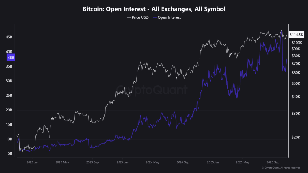 Bitcoin (BTC), yatırımcıların Federal Rezerv’in beklenen faiz indirimi öncesinde kaldıraçlı pozisyonlarını artırmasıyla bu hafta 116.000 doları aştı. CryptoQuant verilerine göre, türev piyasalardaki açık pozisyonlar 37,6 milyar dolara yükselerek spekülatif kaldıraçta önemli bir artışa işaret ediyor. Bu durum, piyasalardaki risk iştahının yeniden güçlendiğini gösteriyor.