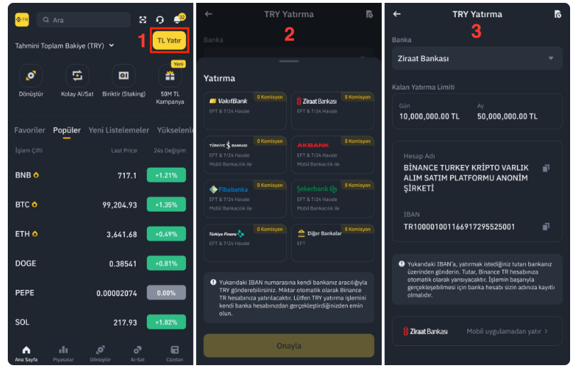 Binance TR’de TL yatırmak için banka havalesi, EFT veya kart ile ödeme seçenekleri bulunur. Hesap içindeki “Para Yatır” veya “TL Yatır” bölümüne gidin. Borsa size bir banka hesap bilgisi verir; kendi banka hesabınızdan o hesaba para gönderirsiniz. Para gelince hesabınızda TRY bakiyesi görünür. Göndermeden önce hesap numarası ve açıklamayı doğru yazdığınızdan emin olun.