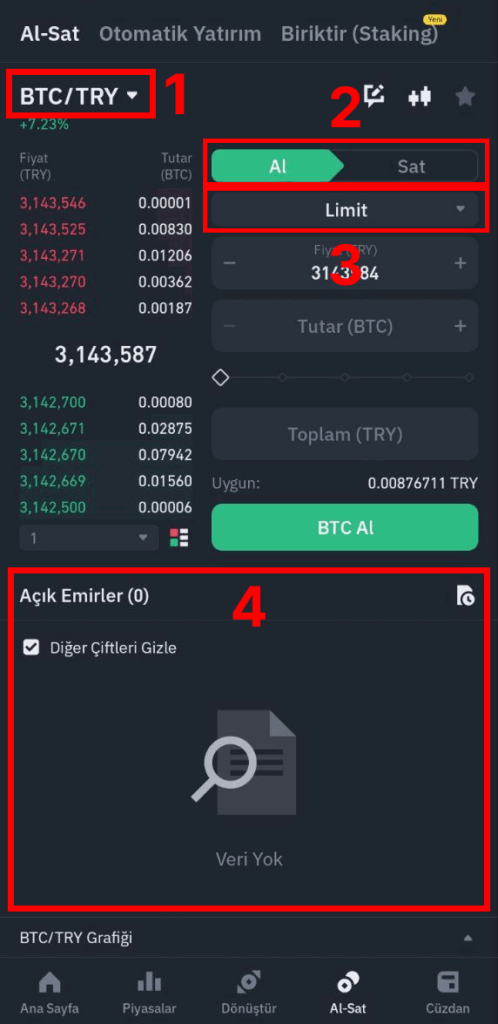 Hesabınızda TL varsa “Al-Sat” veya “Piyasalar” bölümüne gidin. Bitcoin (BTC) sayfasını açın. İki yaygın emir türü vardır: piyasa emri ve limit emri. Piyasa emri: Hemen almak isterseniz bunu seçin; mevcut en iyi fiyattan anında alırsınız. Limit emri: Belirli bir fiyattan almak isterseniz o fiyatı girersiniz; fiyat o seviyeye gelince emir gerçekleşir. Piyasa emri acemisinin kolay yoludur: almak istediğiniz TRY tutarını yazın ve “Satın Al” tuşuna basın. İşlem tamamlandığında hesabınızda BTC bakiyesi görünür.