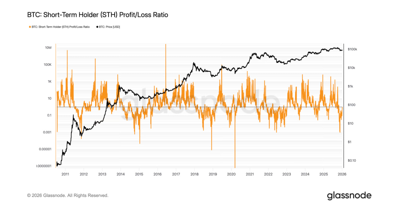 Glassnode, 155 gün ve altında Bitcoin tutan yatırımcıları “kısa vadeli yatırımcılar” olarak sınıflandırıyor. Bu yatırımcı grubunun kârda olan BTC sayısı ile zararda olan BTC sayısının oranı, genellikle piyasanın dip noktalarını tespit etmek için kritik bir gösterge olarak kabul ediliyor.